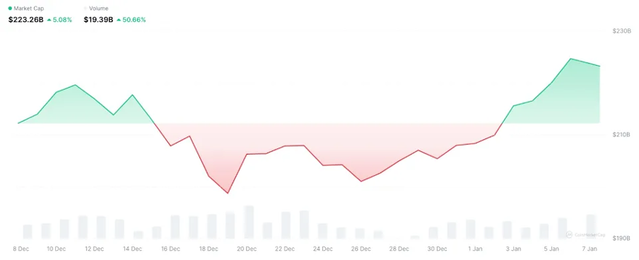Over the last seven days, the BNB Chain sector added $4.5 billion in market capitalization, marking a 6.9% gain. That move erased all December losses and lifted monthly growth to 5.1%. Rising prices were supported by stronger trading interest, with sector-wide volume up 15.8% on the week and 50.7% year-on-year.