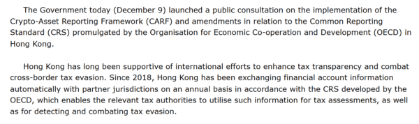 Since 2018, financial account information has been exchanged between Hong Kong and foreign countries under the international standard – the OECD Common Reporting Standard. This process already supports annual information flows that help the authorities to detect irregularities and review compliance risks. Now, officials believe the expansion of these sorts of practices to crypto assets is necessary, given the size and speed of the sector.