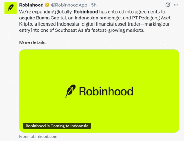 Robinhood plans to enter Indonesia through the acquisition of a brokerage and crypto firm, expected to close in early 2026.Robinhood announced plans to enter Indonesia through the acquisition of PT Buana Capital Sekuritas and PT Pedagang Aset Kripto. The move is a significant expansion into one of the most rapidly growing trading markets in Asia. Reuters reported that the deal is expected to be closed in the first half of 2026.