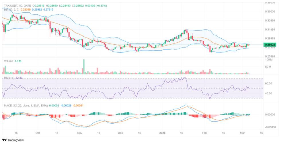 Volume remains modest at around 1.3 million daily, consistent with a consolidating market. Traders watching TRX will need to see a volume-backed breakout above $0.29 to confirm the next bullish leg toward $0.31 to $0.32.